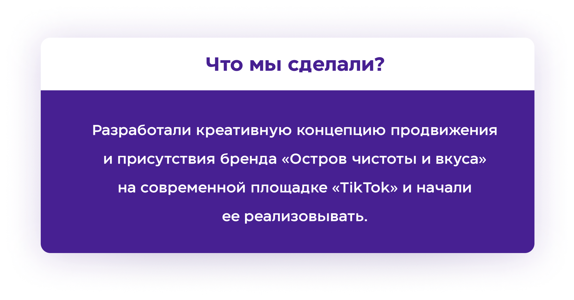 Современная и трендовая площадка «TikTok» позволяет бренду «Остров чистоты и вкуса» эффективно рассказывать историю о своем продукте в близком и понятном аудитории формате, активно вовлекать аудиторию и поддерживать интерес к продукту, а также повышать узнаваемость бренда.